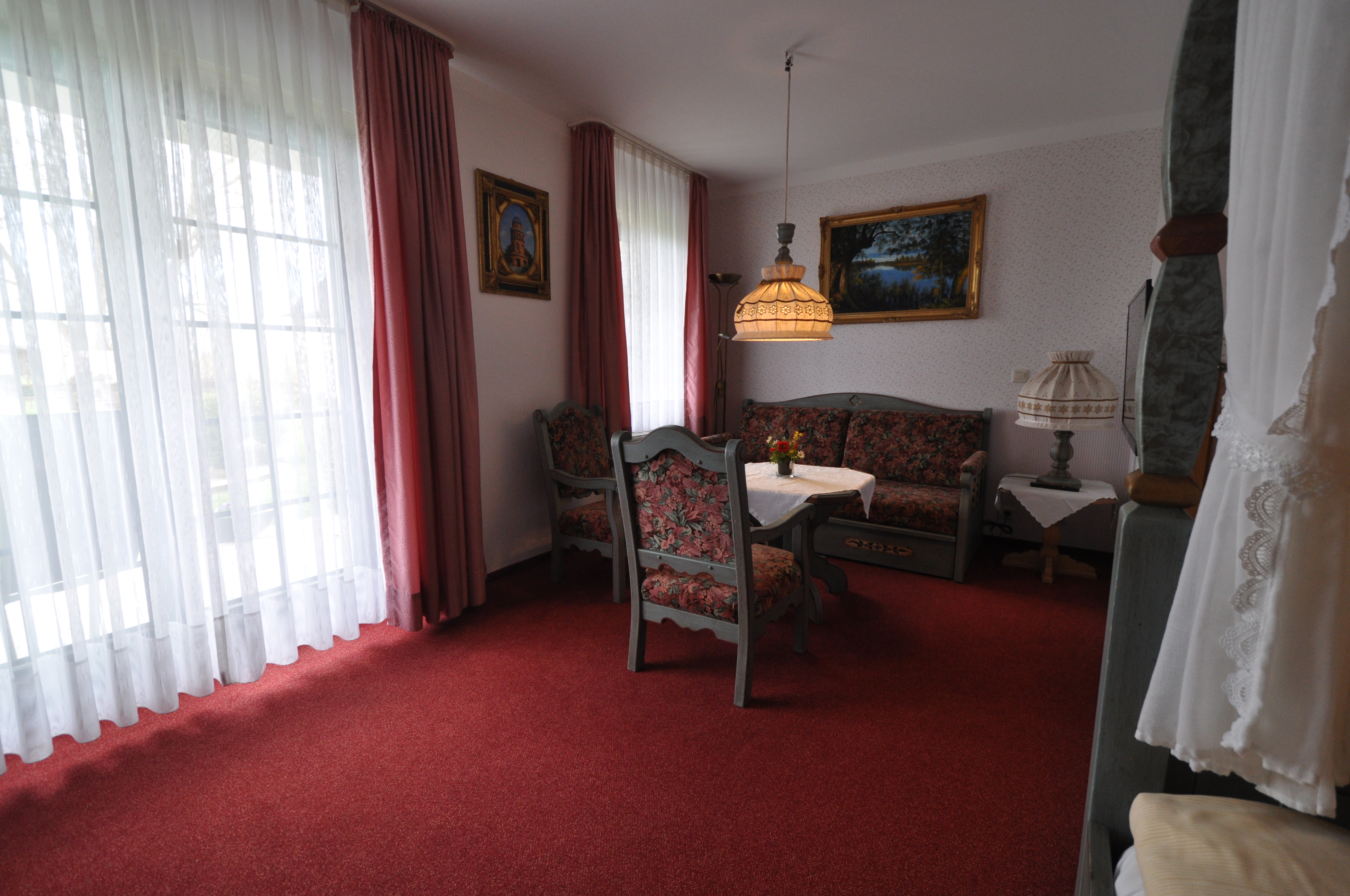 Die geräumigen Classic-Doppelzimmer, liebevoll und individuel im Landhausstil eingerichtet, haben eine gemütliche Sitzecke.